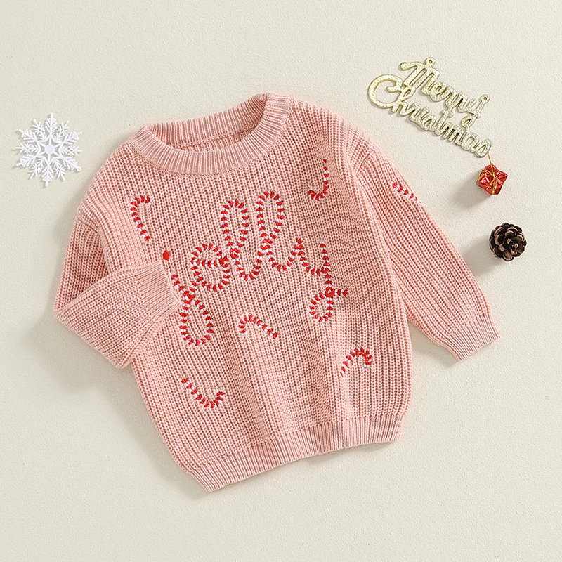 Christmas baby clothes, letter candy cane embroidery, long sleeves and crew neck, knitted fabric, newborn girl sweater, unisex design, simple and stylish, perfect for keeping your child warm and cozy in cold weather.